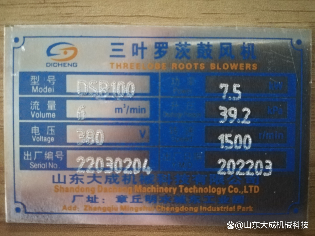 首先認(rèn)識(shí)一下風(fēng)機(jī)銘牌代表的含義:(以大成羅茨風(fēng)機(jī)為例)
